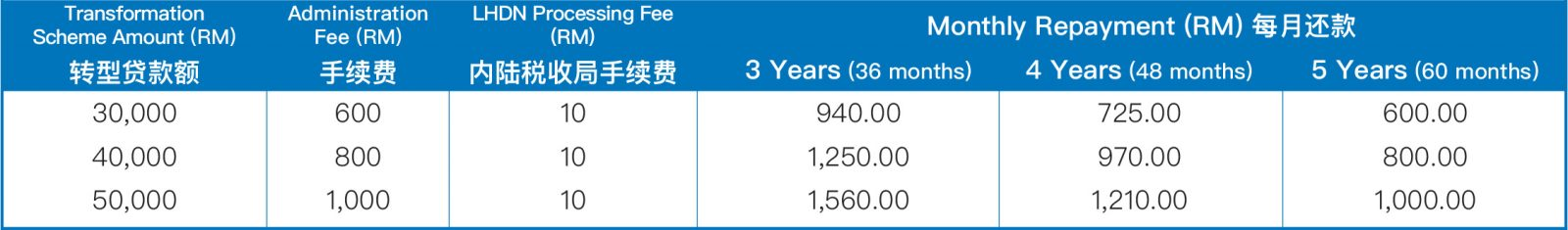 转型贷款数额介于 RM30,000 至 RM50,000;